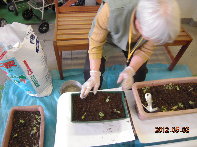 今日はあいにくの雨の為、室内で苗の植え付けをしています。